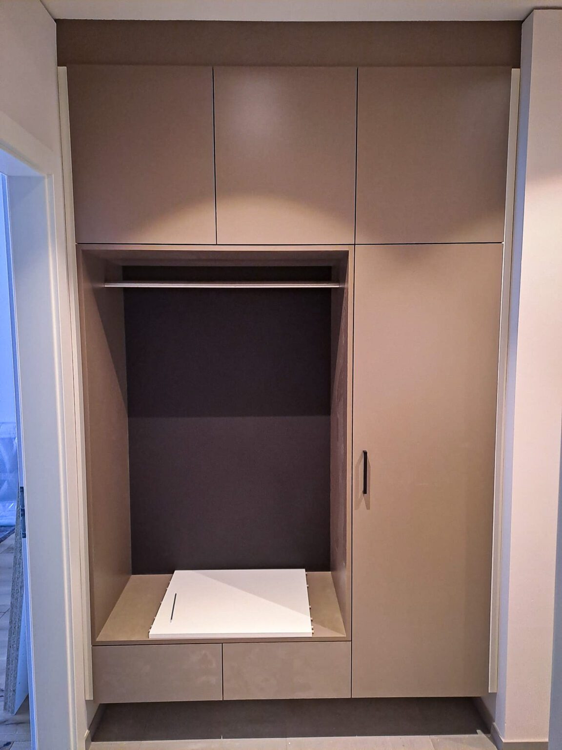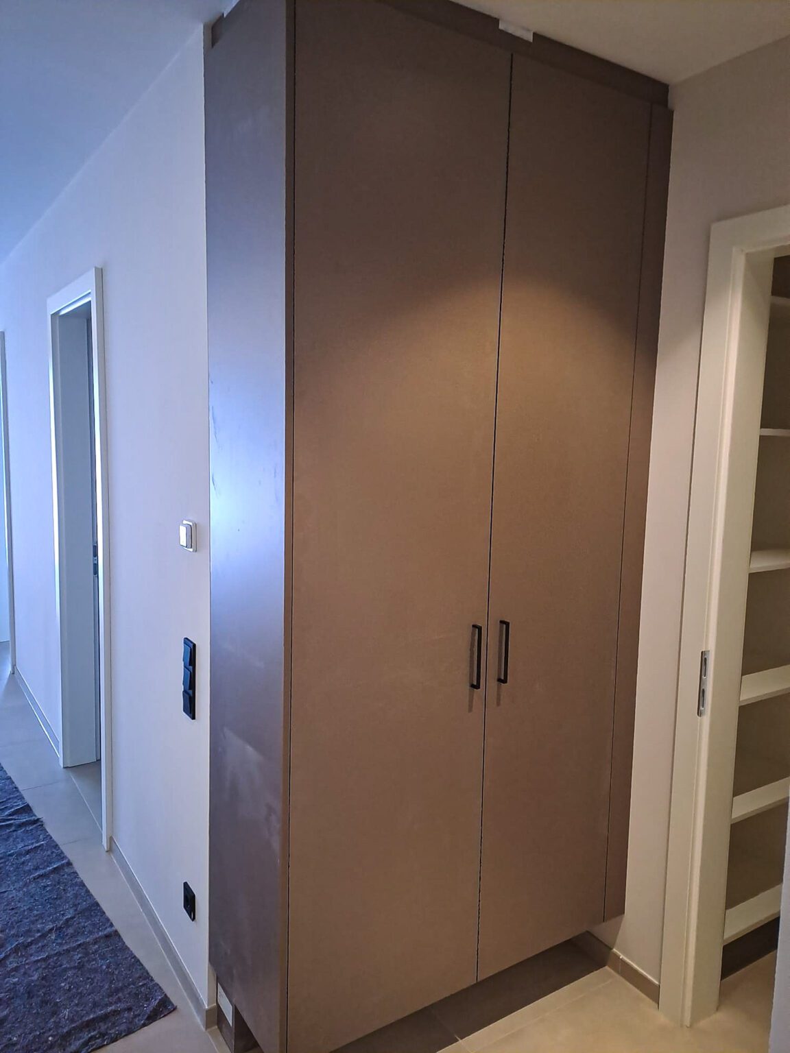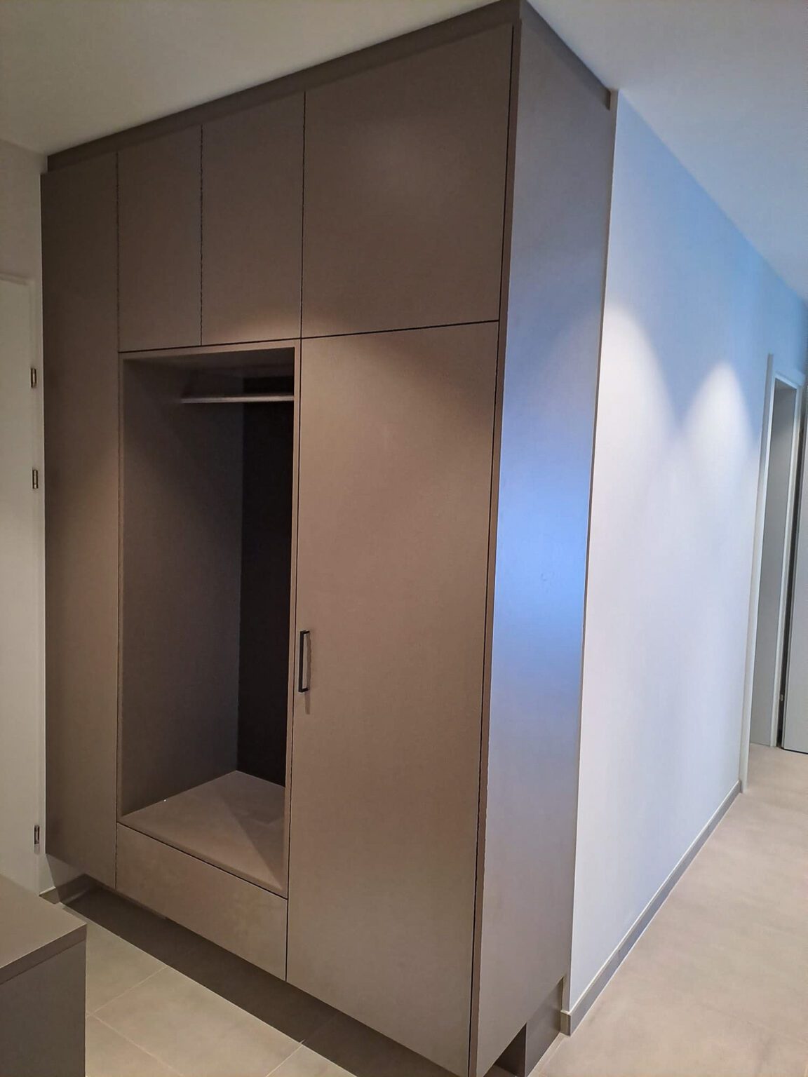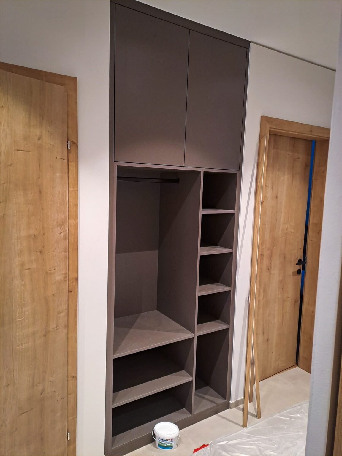 Bei Familie L. begann das Projekt mit einer besichtigung des Hauses. Hierbei wurden mir die Vorstellung und Farbwünsche der Familie präsentiert. Nach dem Ausmessen, folgte die Planung und Herstellung der Schränke. Nach abschluss aller Vorarbeiten, wurden die Schränke vor Ort afugebaut und montiert.